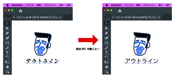 フォントを使ったデータを、同じフォントを搭載していない別のパソコンで開くとそのパソコンが持っている別のフォントに置き換わってしまいます。