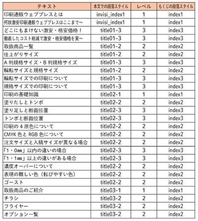 本文の段落スタイルごとに、目次になった時の段落スタイルを設定することができますが、レベルで段落スタイルを統一すると読みやすくなります。