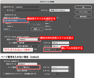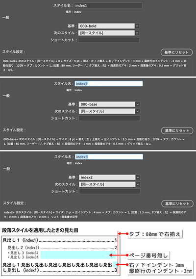 目次用の段落スタイルを3つ作成します。次のような方針で作成していきます。他の段落スタイルと混同しないように「index」という名前のフォルダを作ってその中に保存します。