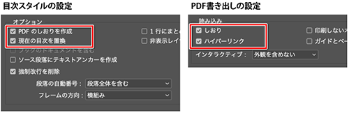 「目次スタイル」と「PDFの書き出しプリセット」で設定変更が必要です。
