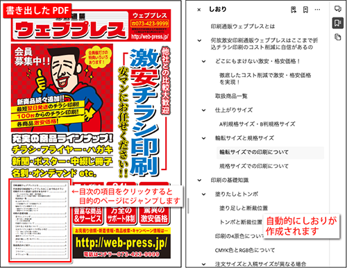 目次の自動生成をすると、PDFを書き出すときに「しおり」「ハイパーリンク」を自動作成することもできます。