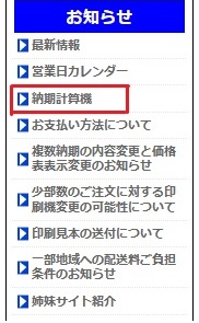 弊社のサイトで左側にある青いバナーの「お知らせ」の下に「納期計算機」のボタンがございます。