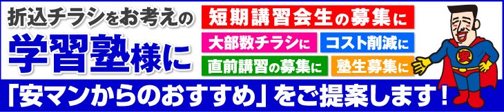 新年度に向けての折込チラシ・直前講習に向けての折込チラシをお考えの学習塾様、大量にチラシをまいている学習塾様、チラシの反響がおちてきたので販促コストを見直したい・とにかく安く印刷したいとお考えの学習塾様、いろいろなカタチでチラシ印刷でお悩みの学習塾様に安マンから用途に応じたオススメをご提案します!