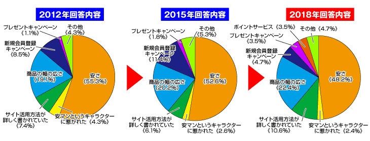 継続的に行なっている、サイト内の情報更新の成果『サイト活用方法が詳しく書かれていた』や、新商品の開発の成果『商品の幅の広さ』の項目が、以前に比べても増加しているのが嬉しく思います。継続は力なりと思ってこれからも地道に行なっていく予定です。