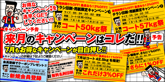 今月は『B判チラシ・コート50kg祭』『D判チラシ・コート57kg祭』『これだけ3%OFFキャンペーン』『さらに1%OFFキャンペーン』『プレゼントキャンペーン』『新規会員登録キャンペーン』『無料名刺印刷』のキャンペーンを開催しています!
