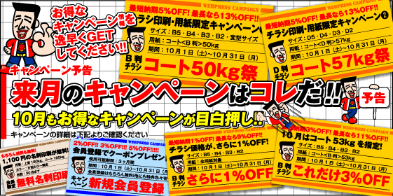 今月は『B判チラシ・コート50kg祭』『D判チラシ・コート57kg祭』『これだけ3%OFFキャンペーン』『さらに1%OFFキャンペーン』『新規会員登録キャンペーン』『無料名刺印刷』のキャンペーンを開催しています!