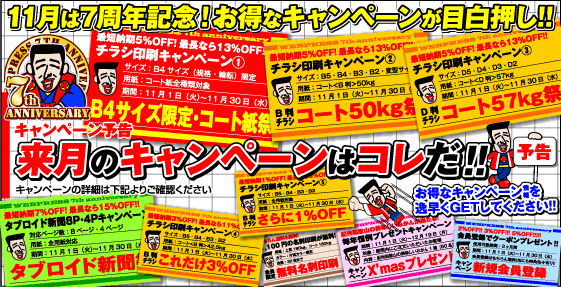 今月は『B判チラシ・コート50kg祭』『D判チラシ・コート57kg祭』『これだけ3%OFFキャンペーン』『さらに1%OFFキャンペーン』『新規会員登録キャンペーン』『無料名刺印刷』のキャンペーンを開催しています!