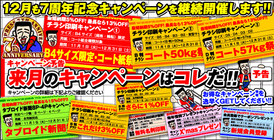 今月は7周年記念B判チラシ印刷・コート50kg祭を開催!!!