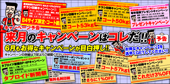 今月は『B4サイズ限定キャンペーン』『B判チラシ・コート53kg祭』『B判チラシ・コート50kg祭』『D判チラシ・コート57kg祭』『これだけ3%OFFキャンペーン』『さらに1%OFFキャンペーン』『新規会員登録キャンペーン』『無料名刺印刷』のキャンペーンを開催しています!