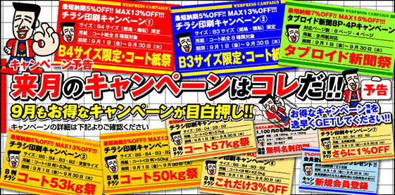 今月は『B4サイズ限定キャンペーン』『B判チラシ・コート53kg祭』『B判チラシ・コート50kg祭』『D判チラシ・コート57kg祭』『これだけ3%OFFキャンペーン』『さらに1%OFFキャンペーン』『新規会員登録キャンペーン』『無料名刺印刷』のキャンペーンを開催しています!