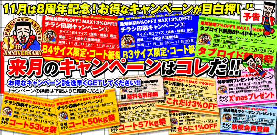 今月は『B4サイズ限定キャンペーン』『B3サイズ限定キャンペーン』『B判チラシ・コート53kg祭』『B判チラシ・コート50kg祭』『D判チラシ・コート57kg祭』『これだけ3%OFFキャンペーン』『さらに1%OFFキャンペーン』『新規会員登録キャンペーン』『無料名刺印刷』のキャンペーンを開催しています!