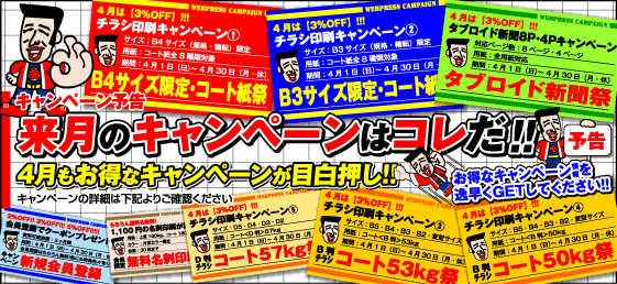 今月は『B4チラシ限定・コート紙[3%OFF]祭』『B3チラシ限定・コート紙[3%OFF]祭』『タブロイド新聞[3%OFF]祭』『B判チラシ・コート53kg[3%OFF]祭』『B判チラシ・コート50kg[3%OFF]祭』『D判チラシ・コート57kg[3%OFF]祭』『新規会員登録クーポンプレゼント』『無料名刺印刷』のキャンペーンを開催しています!