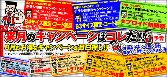 今月は『B4チラシ限定・コート紙[4%OFF]祭』『B3チラシ限定・コート紙[4%OFF]祭』『タブロイド新聞[2%OFF]祭』『B判チラシ・コート53kg[4%OFF]祭』『B判チラシ・コート50kg[4%OFF]祭』『D判チラシ・コート57kg[4%OFF]祭』『新規会員登録クーポンプレゼント』『無料名刺印刷』のキャンペーンを開催しています!