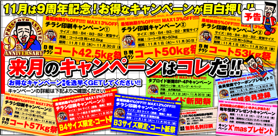 今月は『B判チラシ・コート53kg[5%OFF]祭』『B判チラシ・コート50kg[5%OFF]祭』『B判チラシ・コート42.5kg[5%OFF]祭』『B4チラシ限定・コート紙[4%OFF]祭』『B3チラシ限定・コート紙[4%OFF]祭』『タブロイド新聞[3%OFF]祭』『D判チラシ・コート57kg[5%OFF]祭』『新規会員登録クーポンプレゼント』『無料名刺印刷』のキャンペーンを開催しています!