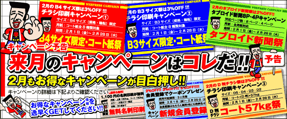 今月は『B判チラシ・コート53kg[5%OFF]祭』『B判チラシ・コート50kg[5%OFF]祭』『B判チラシ・コート42.5kg[5%OFF]祭』『B4チラシ限定・コート紙[4%OFF]祭』『B3チラシ限定・コート紙[4%OFF]祭』『タブロイド新聞[3%OFF]祭』『D判チラシ・コート57kg[5%OFF]祭』『新規会員登録クーポンプレゼント』『無料名刺印刷』のキャンペーンを開催しています!