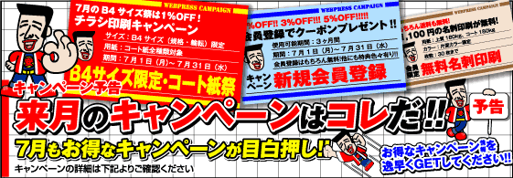 今月は『B4チラシ限定・コート紙[1%OFF]祭』『新規会員登録クーポンプレゼント』『無料名刺印刷』のキャンペーンを開催しています!