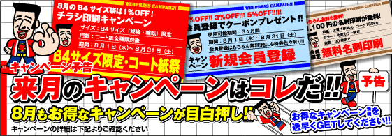 今月は『B4チラシ限定・コート紙[1%OFF]祭』『新規会員登録クーポンプレゼント』『無料名刺印刷』のキャンペーンを開催しています!