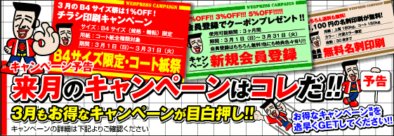 今月は『B4チラシ限定・コート紙[1%OFF]祭』『新規会員登録クーポンプレゼント』『無料名刺印刷』のキャンペーンを開催しています!