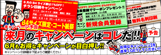 今月は『B4チラシ限定・コート紙[1%OFF]祭』『新規会員登録クーポンプレゼント』『無料名刺印刷』のキャンペーンを開催しています!