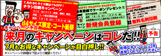 今月は『B4チラシ限定・コート紙[1%OFF]祭』『新規会員登録クーポンプレゼント』『無料名刺印刷』のキャンペーンを開催しています!