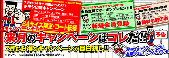 今月は『B4チラシ限定・コート紙[1%OFF]祭』『新規会員登録クーポンプレゼント』『無料名刺印刷』のキャンペーンを開催しています!