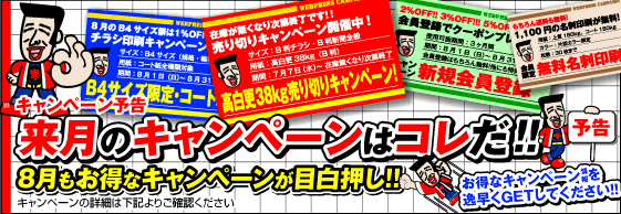 今月は『B4チラシ限定・コート紙[1%OFF]祭』『新規会員登録クーポンプレゼント』『無料名刺印刷』のキャンペーンを開催しています!