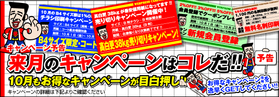 今月は『高白更38kg用紙対象・売り切りキャンペーン』『B4チラシ限定・コート紙[1%OFF]祭』『新規会員登録クーポンプレゼント』『無料名刺印刷』のキャンペーンを開催しています!