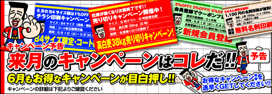 今月は『高白更38kg用紙対象・売り切りキャンペーン』『B4チラシ限定・コート紙[1%OFF]祭』『新規会員登録クーポンプレゼント』『無料名刺印刷』のキャンペーンを開催しています!