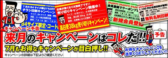 今月は『高白更38kg用紙対象・売り切りキャンペーン』『B4チラシ限定・コート紙[1%OFF]祭』『新規会員登録クーポンプレゼント』『無料名刺印刷』のキャンペーンを開催しています!