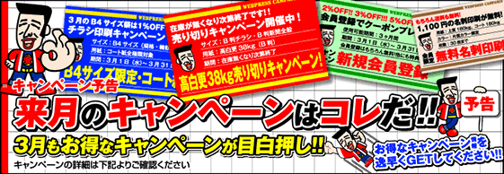 今月は『B4チラシ限定・コート紙[1%OFF]祭』『新規会員登録クーポンプレゼント』『高白更38kg用紙対象・売り切りキャンペーン』『無料名刺印刷』のキャンペーンを開催しています!