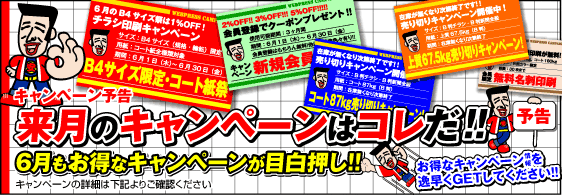 今月は『B4チラシ限定・コート紙[1%OFF]祭』『新規会員登録クーポンプレゼント』『無料名刺印刷』のキャンペーンを開催しています!