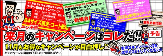 今月は『B4チラシ限定・コート紙[1%OFF]祭』『用紙限定売り切りキャンペーン』『新規会員登録クーポンプレゼント』『無料名刺印刷』のキャンペーンを開催しています!