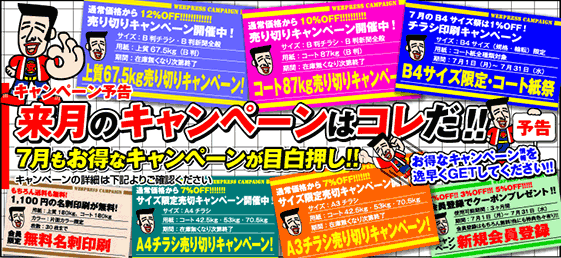 今月は『B4チラシ限定・コート紙[1%OFF]祭』『用紙限定売り切りキャンペーン』『A3・A4チラシ売切キャンペーン』『新規会員登録クーポンプレゼント』『無料名刺印刷』のキャンペーンを開催しています!