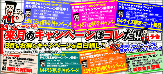 今月は『B4チラシ限定・コート紙[1%OFF]祭』『用紙限定売り切りキャンペーン』『A3・A4チラシ売切キャンペーン』『新規会員登録クーポンプレゼント』『無料名刺印刷』のキャンペーンを開催しています!