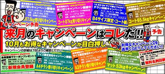 今月は『B4チラシ限定・コート紙[1%OFF]祭』『期間限定コート65.5kg・マット53kgキャンペーン』『用紙限定売り切りキャンペーン』『A3・A4チラシ売切キャンペーン』『新規会員登録クーポンプレゼント』『無料名刺印刷』のキャンペーンを開催しています!