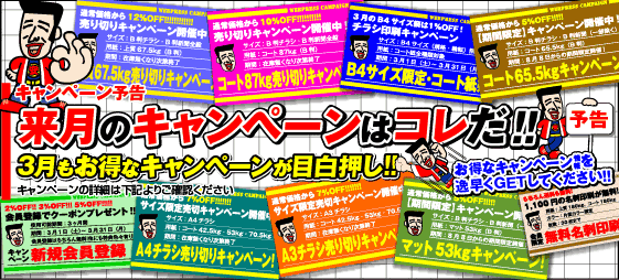 今月は『B4チラシ限定・コート紙[1%OFF]祭』『期間限定コート65.5kg・マット53kgキャンペーン』『用紙限定売り切りキャンペーン』『A3・A4チラシ売切キャンペーン』『新規会員登録クーポンプレゼント』『無料名刺印刷』のキャンペーンを開催しています!