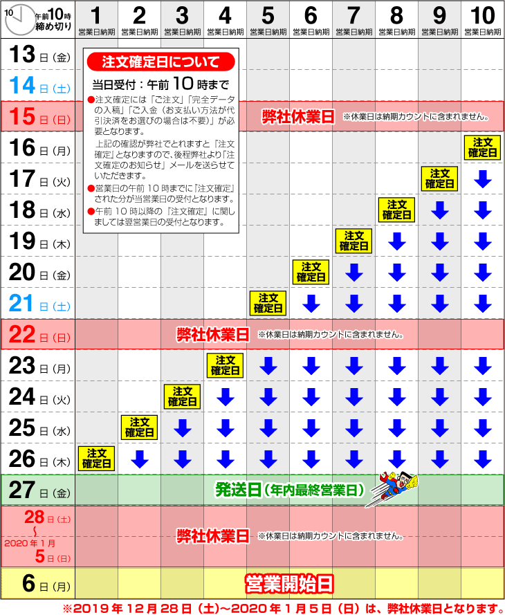 2019年12月28日(土)から2020年1月5日(日)までは休業日となります。 |