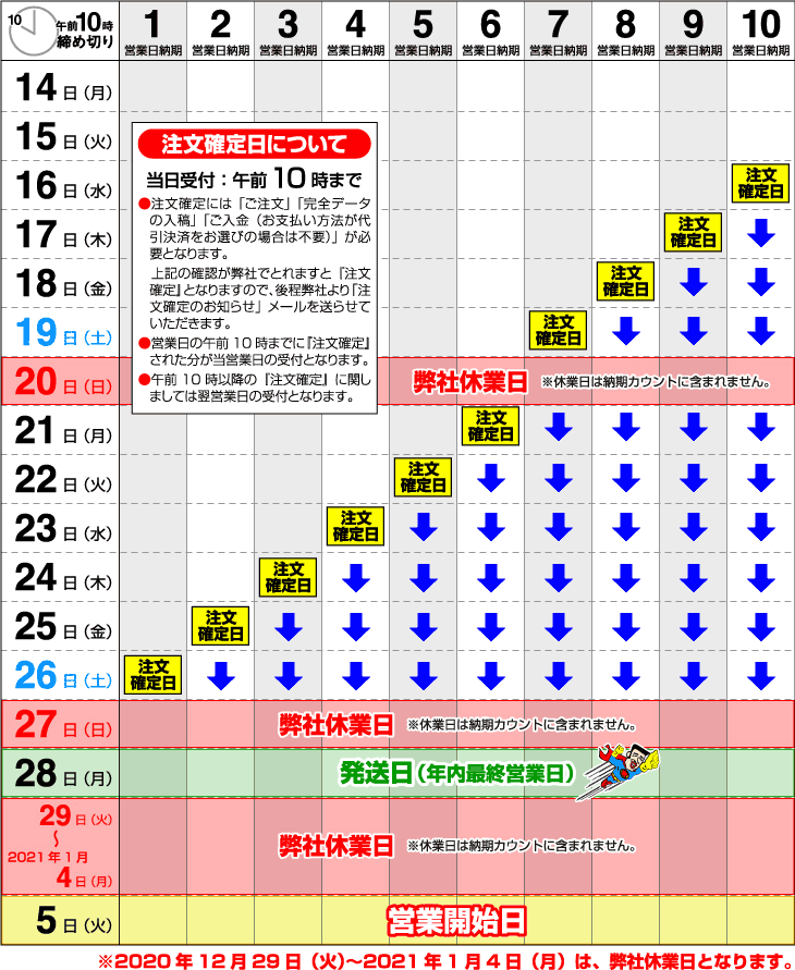年内に商品の発送をご希望の際には下記カウント表をご参照してください。