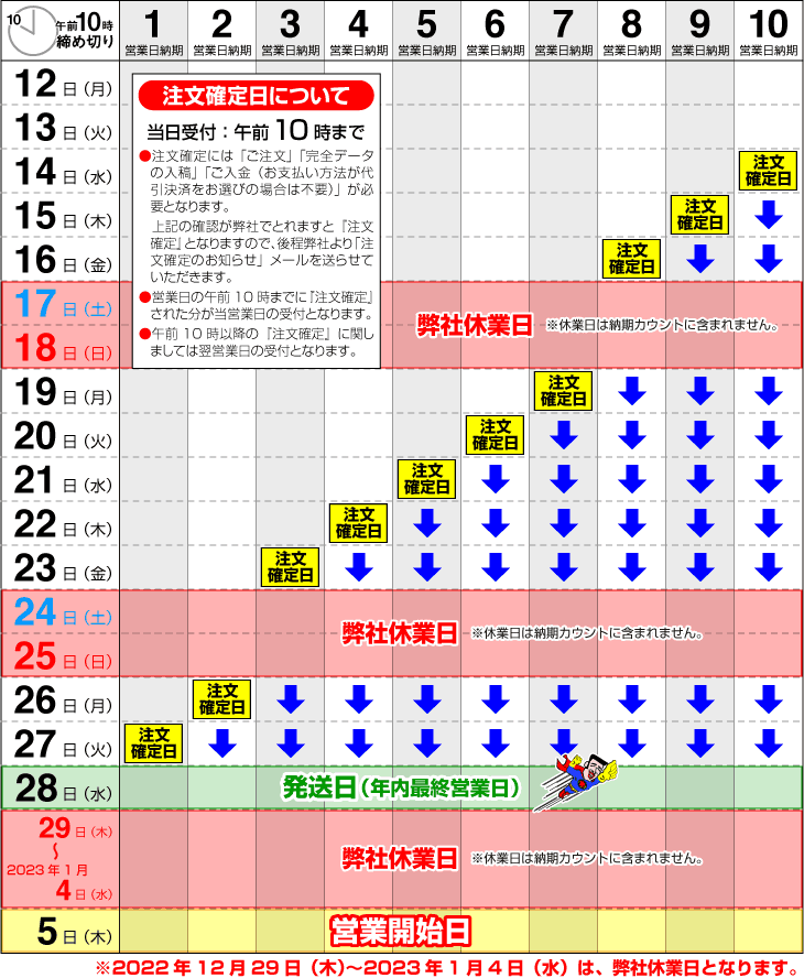 年内に商品の発送をご希望の際には下記カウント表をご参照してください。