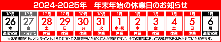 | 12月27日(金) | 2024年最終営業日 17:00までの営業となります。 |