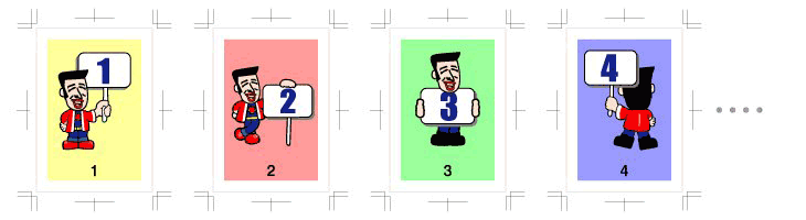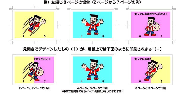 但し、ページ順の間違いを避ける為、デザイン上にノンブルがある場合でも、必ず上記「ノンブルがデザイン上に無いデータの場合」のように、ページ順が分かるようにしてください。