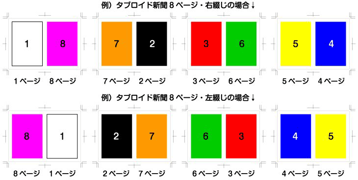 仕上がりに合わせた面付けのページでの作成がご希望の場合、面付けを想定した状態のデータで作成していただいても問題ありません。(例えば、タブロイド新聞8ページの右綴じの場合は、「1・8ページ」「7・2ページ」「3・6ページ」「5・4ページ」という組み合わせになります。)
