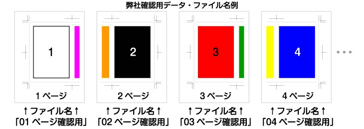 ザインの都合上見開き、または面付けの状態でデータ作成したものの、ページ面付けに自信が無い...という場合には、『弊社確認用データ』を単ページ毎に作成していただき、そのページ数をファイル名をにしてください。ファイル名がページ数にしていただいた場合、データ上のノンブルだけで無く、ファイル名でも順番を【二重で確認】させていただきます。