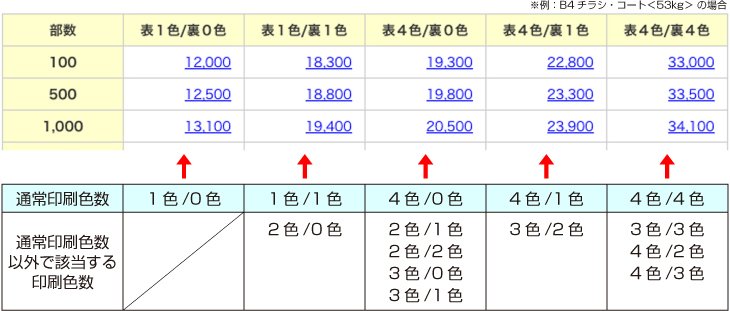 チラシ印刷を2色等で印刷する場合の価格表の見方について