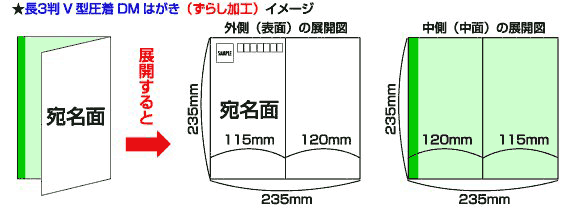 このページでは、長3判V型圧着DMはがき(ずらし加工)を紹介しています。