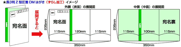 このページでは、長3判Z型圧着DMはがき(ずらし加工)を紹介しています。