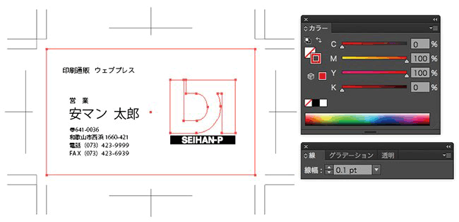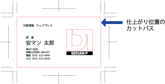 - 仕上がりの名刺サイズへのカットもレーザー加工機を使用しますので、仕上がり位置の名刺サイズのカットパス(55×91mm)も必ず入れておいてください。