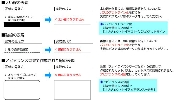 - レーザーはカットパスに沿うようにカットしていきますので、パスの線幅を太くした線や破線、イラストレーターの効果(アピアランスで作成した形状等)で表現したもの等は、プレビュー通りにはカットされません。これは、イラストレーター上の見た目はその通りになっていても、データ上では、通常の線だけになっている為です。パスのアウトライン化やオブジェクトの合体、オブジェクトのアピアランスの分割などを行ってください。