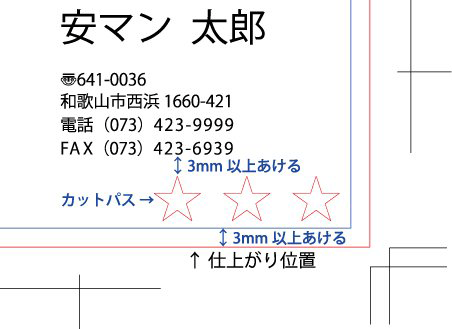 - 塗り足しを付けてください。切れてはいけないロゴや文字等につきましては、断裁位置より3mm以上内側で作成してください。詳しくはコチラでご確認ください。