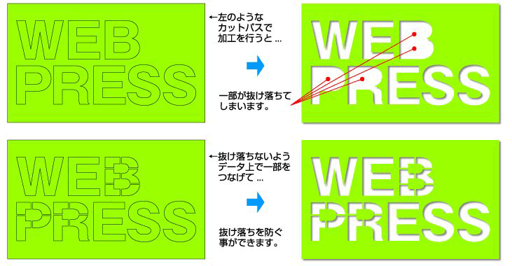 - カットパスのつながる部分には気をつけて作成してください。つながる部分が無い場合、抜け落ちてしまう事がありますので、ご注意して作成してください。